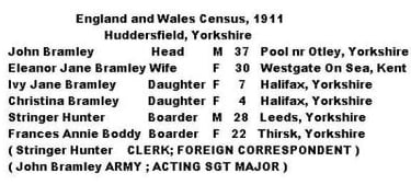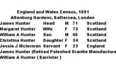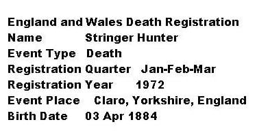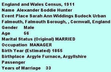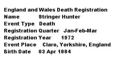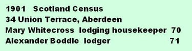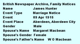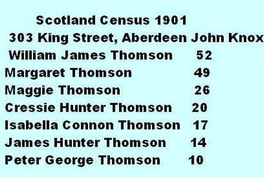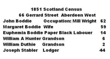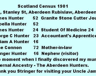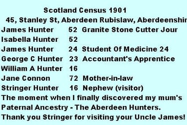 Stringer played a very special part in the creation of this part of the family history. If he hadn’t gone to stay with his Uncle James in Aberdeen circa 1901, I may not yet have discovered the Hunter Family History beyond Alexander Boddie Hunter. Therefore, I am very much indebted to both Stringer and the 1901 Scottish Census which opened the gates of Aberdeen to me. See that census under his uncle's section.