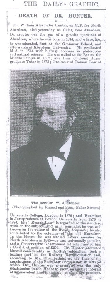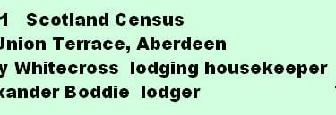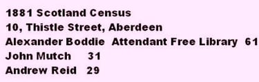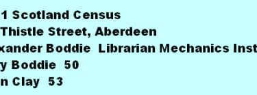 John and Margaret’s youngest son, Alexander Boddie, born in 1829, was a Librarian Mechanics Instructor by trade, and his sister Margaret named one of her sons Alexander Boddie Hunter. He married Mary Davidson of Peterculter, Aberdeen, but when and if there were children I don’t know. The 1881 census shows them living at 10,Thistle Street. Mary died in 1887 and Alexander had taken in lodgers by the 1891 census. 1901 finds him as the only lodger at Mary Whitecross’ house at 34, Union Street. They are both seventy. Alexander died on the 16th September 1905.