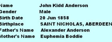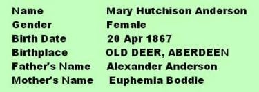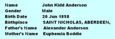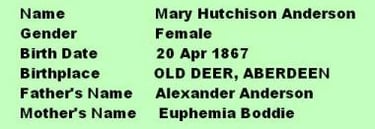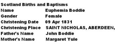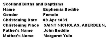 Euphemia was born in 1831, and christened on April 9th. She was John and Margaret's youngest child. She married 25 year old Alexander Anderson on July 13th, 1855, in the St Nicholas part of Aberdeen. They had four children - see their details at the end of this section and above. Alexander, christened on 7 April 1830, was the son of William Anderson and Mary Gibson, both born in 1810.