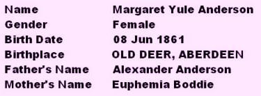 Euphemia and Alexander's eldest daughter, Margaret Yule Anderson, born 8 June, 1861, emigrated to Singapore with her husband James Smith Scott, a master mariner, born in Aberdeen on 12 July, 1856, the son of George Scott and Isabella Jolly who had married in Aberdeen on 16 May 1840. Euphemia passed away in 1904, 3 years after Alexander's passing in 1901. Their daughter Margaret will now be the main focus here.