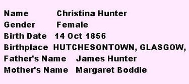 She was not at home for the 1851 census but living at 150, Kingsland Place with her unmarried sister Isabella. Williamina gave birth to Isabella Sinclair Hunter on October 10th 1858. Her maternal grandmother was called Isabel, but I think it was the closeness she felt to her sister that made her choose Isabella. The father is unknown but his name was probably Sinclair given this name didn't previously appear in the family. It was common practice in Scotland, to use surnames as middle names. Often the mother's maiden name. Isabella almost certainly died early because she is absent from Williamina's life thereafter.