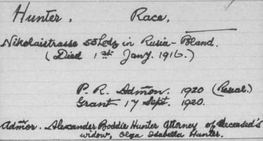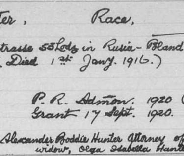 HUNTER Race of Nikolaistrasse 53, Lodz, Poland who was last seen alive on 5 dec 1915 and whose dead body was found on the 1 June 1916 in the sea off the coast of Essex. london 17 august to Alexander Boddie Hunter, gentleman Attorney of Olga Isabella Hunter Effects £113. 1s.8d. How Race came to be there remains a mystery.