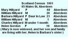 On January 4th, 1892, John Hillyard died in Aberdeen, aged sixty-seven. The 1901 Census shows his widow Mary, now sixty-eight, living at 85, Wales Street, Aberdeen with William and Barbara. She also has the company of her one-year-old grandson William and newly-born Charles (see his Golden Wedding photo with Margaret opposite) Barbara's younger sister, Helen, is also at Wales Street. A very special time for Mary. She died on December 20th, 1903, months before her grand-daughter Lillie's birth in Manchester.
