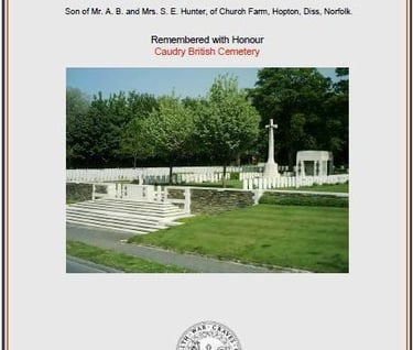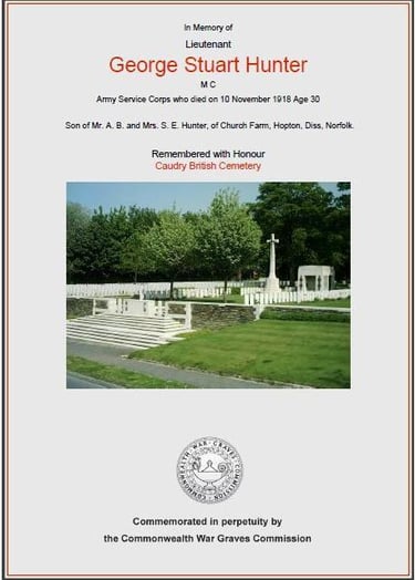 The Kilkenny Moderator of 20/11/1918 ran George's obituary, which noted ... "his father had been manager of Kilkenny Woolen Mills, and that George had been on holiday in Germany when the Great War broke out, but managed to get out with one of his brothers and enlisted at York in September 1914. He was later commissioned and was mortally wounded while leading his company into action on 5/11/1918, attd to 13th Battalion Rifle Brigade. His father was noted as being a Councillor for Leeds and his uncle as the late Dr. W.A. Hunter, MP for North Aberdeen."