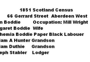 John and Margaret were married on the 12th July 1817 in the Saint Nicholas part of West Aberdeen where they went on to raise their family. The 1841 census has them living in George Street with Margaret Junior a cotton reeler and John Junior, a printer. Isabella, Agnes and Alexander are also in the household. By 1851, they had moved to 66, Gerrard Street. Only Euphemia, their youngest child born in 1831, is with them, working as a Paper Black Labourer. However two of their grandsons are staying with them. Their daughter Margaret’s eldest son, William Hunter and their daughter Agnes’s youngest son, William Duthie.