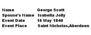 I must stop and salute William Yule here because he adds yet another 'great' to my growing collection. So, now we have no less than a great-great-great-great-great-grandfather in the aforementioned William Yule. Given my own American father's name, William Williams, William Yule is aptly named. But we mustn't stop there because IGI records record a father for William Yule ... step forward John Yoole. Incidentally, there are many variants of ' Yule '. John was born in 1696 in St Nicholas, Aberdeen and adds a sixth great to my lineage. I have no records of his wife's name or other children besides William. However ... there is a record of John's parents who become my great-great-great-great-great-great-great-grandparents! William Yule and Isobell Smith. Their marriage took place in Old Machar, on April 23rd 1687. As well as John, they had James born in 1693, Janet born in 1700, and Isobel born in 1703.