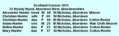 Alexander and Christina showed a meticulous sense of order and symmetry with births spaced every two years and only in odd years. Adam’s birth in 1826 broke the pattern at last. Many of the daughters went into the cotton industry as cotton reelers, and the family lived at the appropriately named Wyndy Wynd in Aberdeen West. Christina was still living at home in her forties with five of her sisters having moved on by the 1850s. Adam was the last of the sons to leave home, working as a hair cloth weaver.