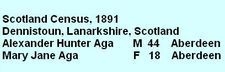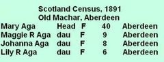 Alexander and Mary Aga were no longer living together by the the time of the 1891 Census. Mary was still in Aberdeen, but Alexander was in Glasgow. By 1901, Mary has moved to Glasgow with Margaret, Johanna and Lilly, but Alexander is lodging elsewhere in the city. She has reverted to her maiden name of Smith. Given the marriage break-up therefore, why would Mary move to Glasgow where Alexander has been living for several years? A mystery.