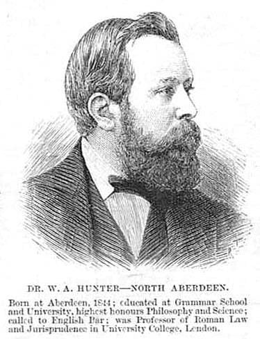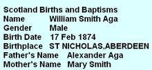 Williamina gave birth to a son on January 16th 1861 at West North Street, Aberdeen, and registered him as William Hunter on February 5th. However, he became known as William Duncan thereafter, following court proceedings. He was at his grandmother Christina's home for the 1861 census with Williamina, now a powerloom weaver. Nothing is known of William's father other than his surname. Similarly with Williamina's third child, Alexander Aga Hunter, born on October 22nd, 1864, at Farquhars Court 17, Upper Kirkgate, Aberdeen, and registered on November 11th.