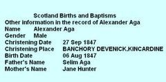 When James McCarthy published "Selim Aga: A Slave's Odyssey" in 2006, he didn't know the identity of the woman with whom Selim had a son. Since then, relatives of the boy have come forward, and the mystery lady was Jane Hunter. Jane's story is both intriguing and poignant. She was born in 1813 and christened on May Day. At the age of thirty-four, she gave birth to Alexander Hunter Aga on August 6th 1847 in Aberdeen. The father was Selim Aga born in The Sudan about 1826.