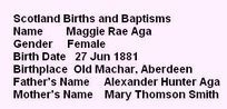 Alexander and Mary's fifth daughter, Margaret Rae Aga, was born in 1881 and became a fancy box maker. She gave birth to William Rae Aga in 1899 in Glasgow. No details of the father are known, but in 1902, she married Duncan McPherson, also in Glasgow with Joan Palmer Aga McPherson born the same year. Margaret married William Heaney in 1935. She died in 1948.