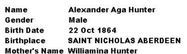 Andrew was the eldest son of Alexander and Christina, named after his maternal grandfather (or the saint!) He was baptised on April 3rd 1815 at Saint Nicholas, Aberdeen. As yet, I have no further definite information about him. The 1841 English Census records two Andrew Hunters from Scotland of the right age. One living in london, and one in Manchester.
