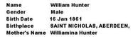 He was christened on the 28th November 1821. His parents had named one son after Saint Andrew, the next after King James, and now their third after the father. An Alexander Hunter married Catherine Ann Sim on September 1st 1848 at Saint Nicholas, Aberdeen. Otherwise, nothing more definite for Alexander. The 1841 English Census records an Alexander Hunter of Scotland, aged twenty, living in Liverpool.