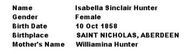 She was christened on the 10th February in Aberdeen and was known as Isabella. She was named after her maternal grandmother. She became a dressmaker, and would appear to have remained single. The 1851 Census records her living at 150, Kingsland Place with her sister Williamina. By the 1861 Census, she is living with her mother again. Her father had passed away a few years earlier. Isabel died in 1874, three years after her mother.