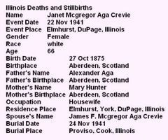 Alexander and Mary's second daughter, Janet McGregor Aga, was born in 1875. She emigrated to Illinois, USA, marrying James Fleming Crevie on July 9th, 1903. They had a daughter Jennette Mary, born on August 16th, 1908.
