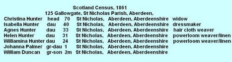 She was christened on December 28th 1890 in Aberdeen. She became a hair cloth weaver, and moved from the family home before the 1851 Census. Her only child, Johanna Agnes was born in 1859, and christened at Saint Nicholas, Aberdeen on the 5th October. The father's identity is not known for certain, nor whether he married Agnes. What is known is that although Johanna was christened 'Hunter', she is recorded as Johanna Palmer in both the 1861 and 1871 Censuses. In the former, she is with Agnes in Christian Hunter's household as a grand-daughter. In the latter, she is recorded as the niece of Helen Gray, the married sister of Agnes.