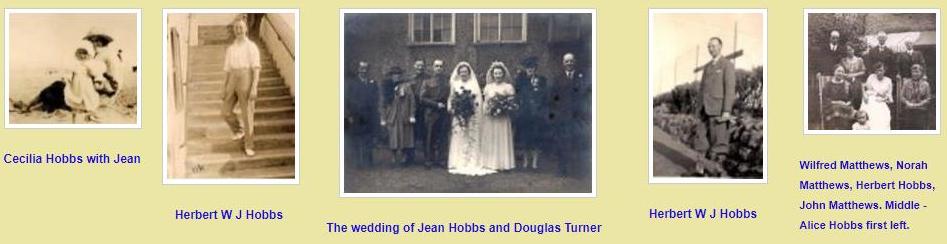 Herbert William John Hobbs (1890-1937) married Cecilia Gertrude Matthews in 1920 in West Ham. Born in Glasgow in 1893, Cecilia was the daughter of John and Jeanie Matthews, both from Edinburgh and sister to Wilfred John Maxwell Matthews. The 1911 Census records the family living in Leyton, with John an Insurance Clerk and Wilfred a Commercial Clerk. Herbert and Cecilia's first child was Mary Ann Hobbs, born in 1921. Jean Cecilia Mary Hobbs arrived in 1922, and John Herbert Edward Hobbs in 1925. All were born in Ilford. Herbert passed away on Feb 22, 1937 in Ilford. Jean married Douglas Turner in Sept 1943 in Ilford (see photo below)