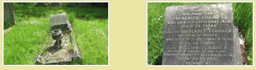 The 1891 Census records them living at 45 Grove Street, St George in the East. William was working as a bread baker. The 1901 Census records them living at 184 Evelyn Street, Deptford with their sons William, aged 9, and Frederick, 7, both born in Whitechapel. Frederick was born on 27 October 1893. Ludwig Schweitzer and Carl Roeger, both German Subjects, are working for William in his butcher’s shop. By 1911, William has retired and they are living in East Ham. Some shop addresses for the Fluhrer family were: 98 Lathom Road, East Ham (1905), 15 High Street North, East Ham (1908) and 10 Broadway, Barking (1912-1914). Their son, Frederick Charles, died on September 12th,1928, aged just 34. Margaret died on September 10th, aged 66. William died on the 7th December, aged 68 at Berry House, Berry Lane, Laindon, Essex. Their gravestone at the City of London Cemetery and Crematorium, touchingly, says “RE-UNITED”.